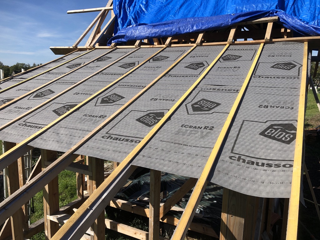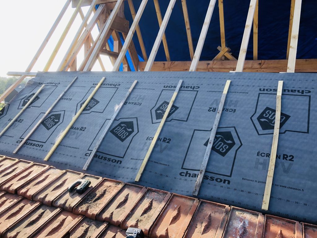J’ai commencé à poser l’écran sous toiture, qui ajoute une sécurité face aux fuites.