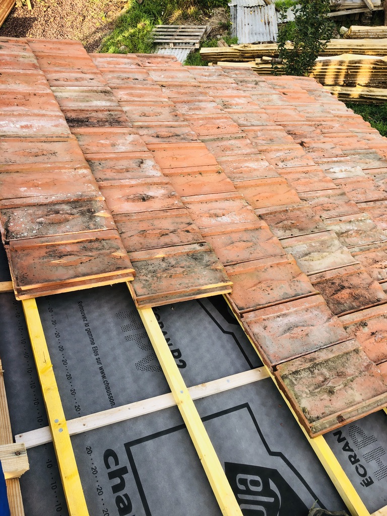 Cependant, j’avais déjà acquis un lot de magnifiques tuiles mécaniques du début du siècle. Impossible de ne pas les utiliser. Mon choix a donc été de les poser sur le toit de la cuisine, originellement pensé en tôle.