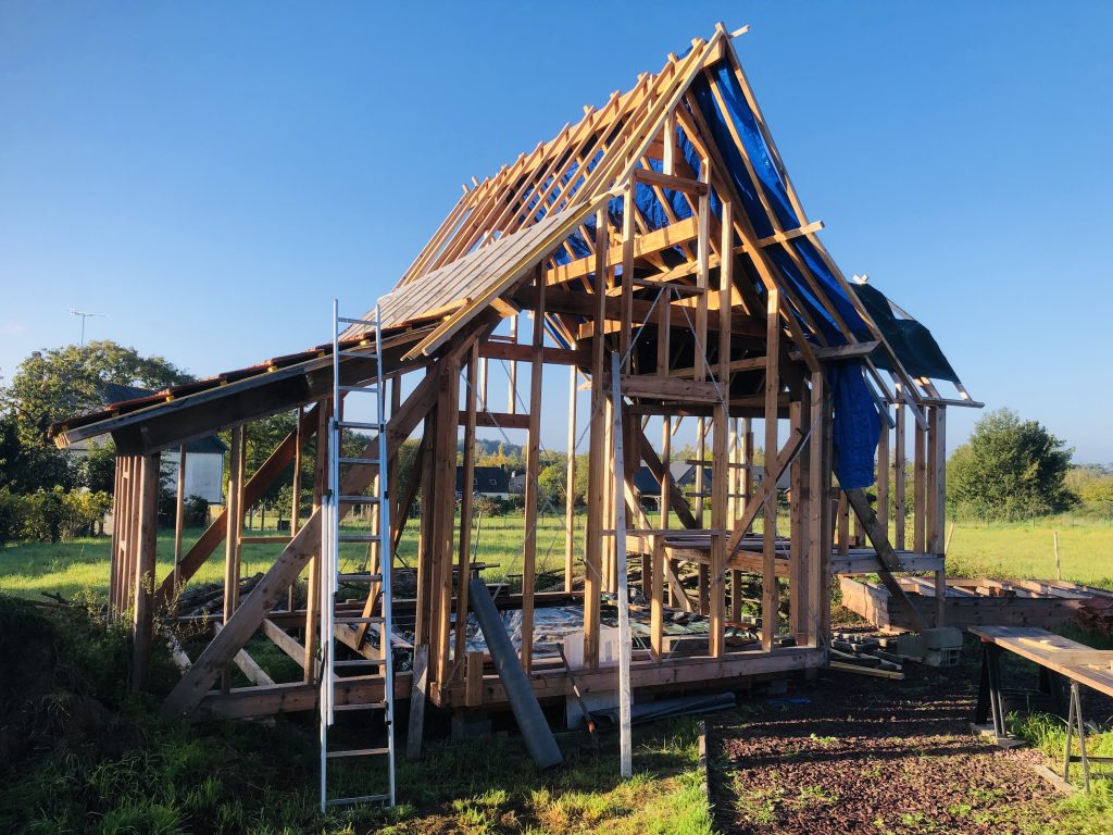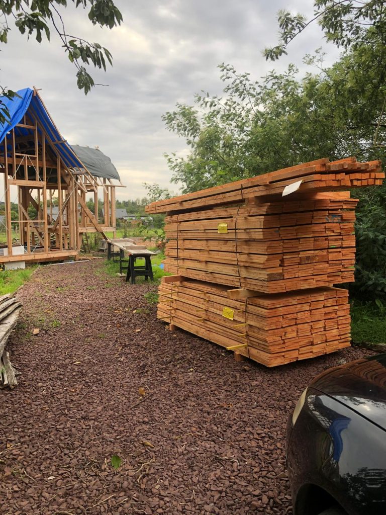 Le 19 septembre, ça sentait bon le Douglas dans l’allée qui mène à l’atelier de Théodore ! Et pour cause, ce joli tas de planche fraichement livré par la scierie Woodstone à Bain-sur-Oust destiné à réaliser la toiture en bardeaux.