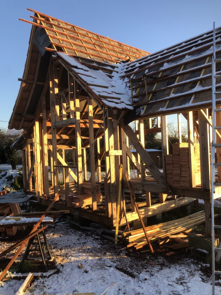 J’ai terminé la moitié du toit est. Et j’ai essentiellement travaillé aujourd’hui sur… la finition de la charpente du deuxième pan de la chambre.