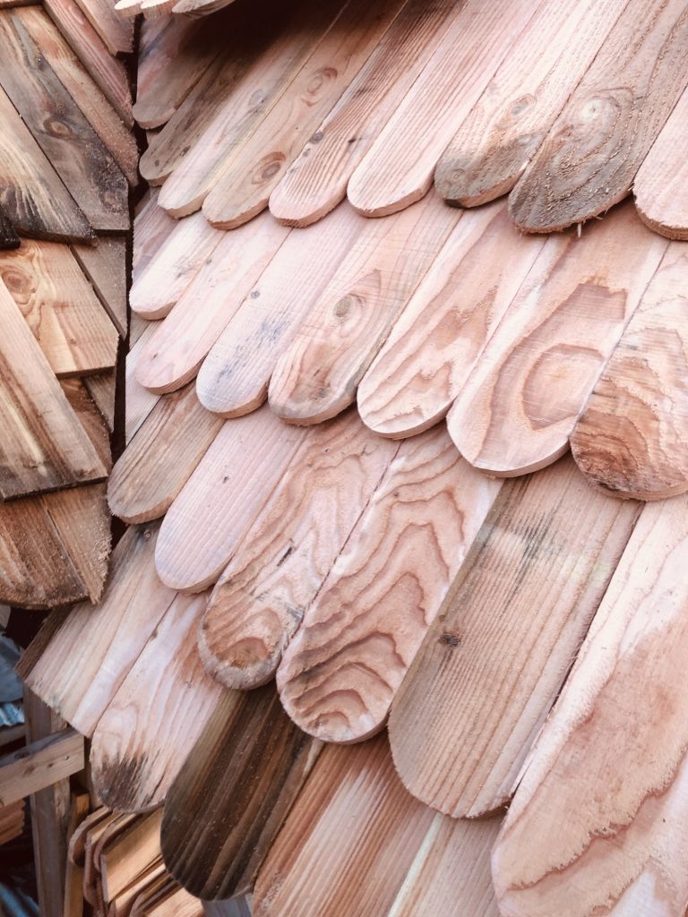 Cela n’a pas été un crève-cœur que de changer de matériaux, que du contraire ! J’ai opté pour les bardeaux de bois. C’est éco (lo et nome), original, ça sent bon quand on les coupe, c’est trop joli, on peut faire les forme qu’on veut, c’est facile à poser.. C’est adopté !