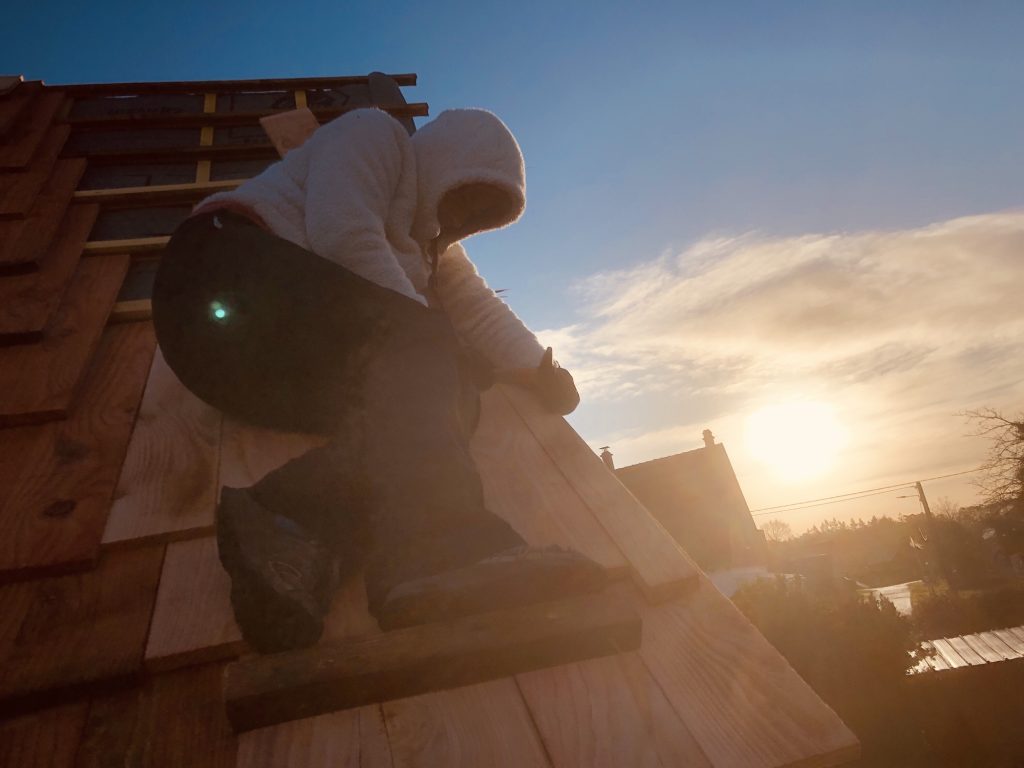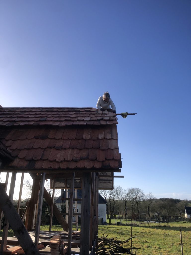 Toutes les planètes sont alignées ce matin : il ne pleut pas (super rare), je suis en forme physiquement (le renforcement musculaire d’hier fait ses effets), Soazig est disponible la journée pour m’aider, j’ai préparé les bardeaux spéciaux. Tout est là pour pouvoir bien avancer sur le chantier.