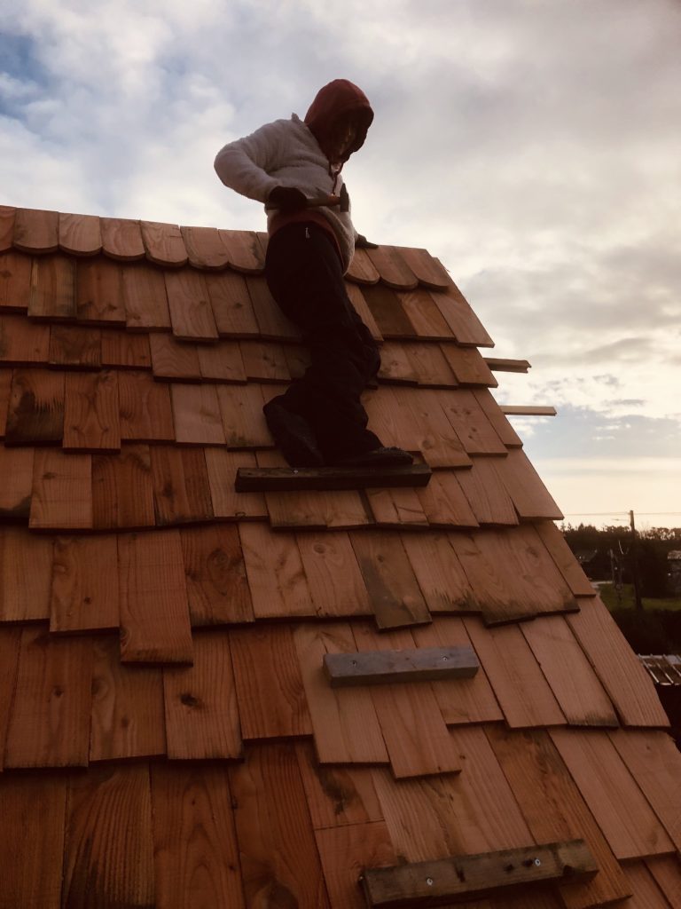 Je suis arrivé au chantier ce matin avec soazig, Il y a un peu de vent, mais on a eu un beau soleil. On avait très froid parce que le vent l’était. Elle m’a aidé à finir le pan principal, ce n’était pas évident de la voir dans le vent, tenir sur des bouts de bois fixes dans les bardeaux.